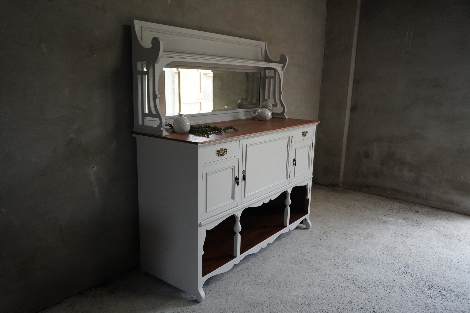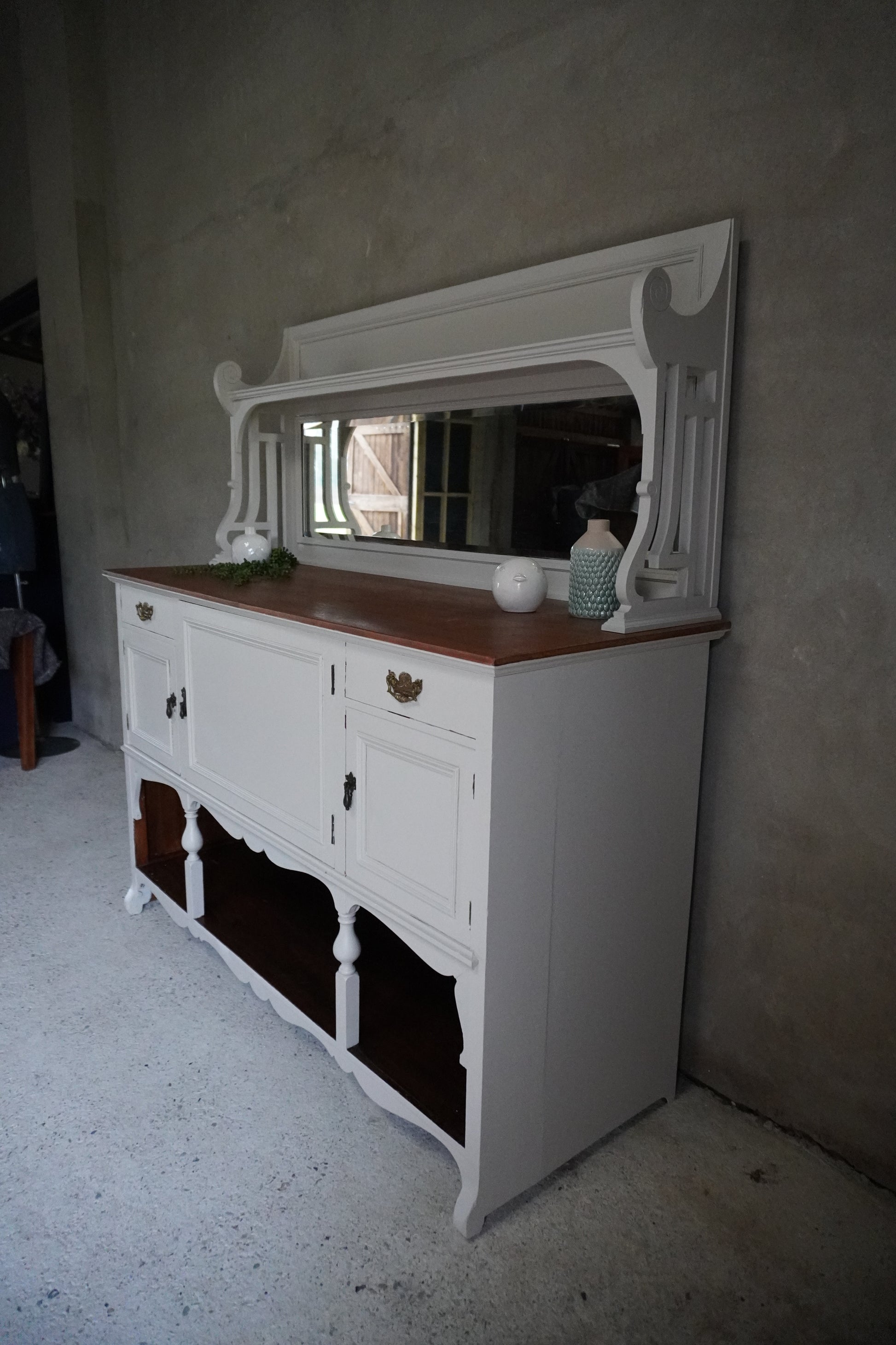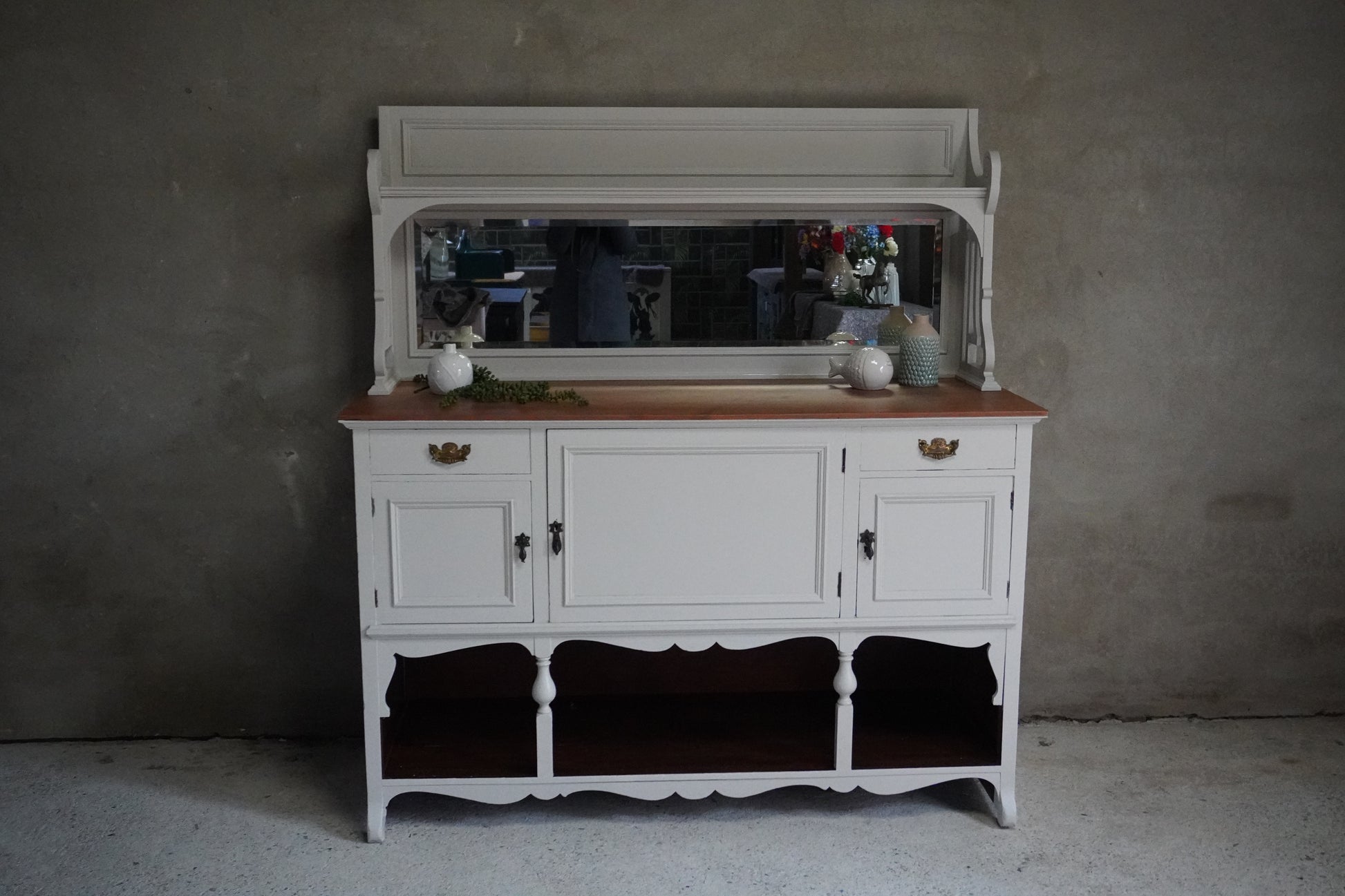 Een kwaliteit meubel. Half blinde zwaluwstaart verbindingen. Het dressoir kan ook zonder de opbouw/spiegel worden gebruikt. Deze kast is een antiek meubel en heeft dus ook tekens van z’n verleden.