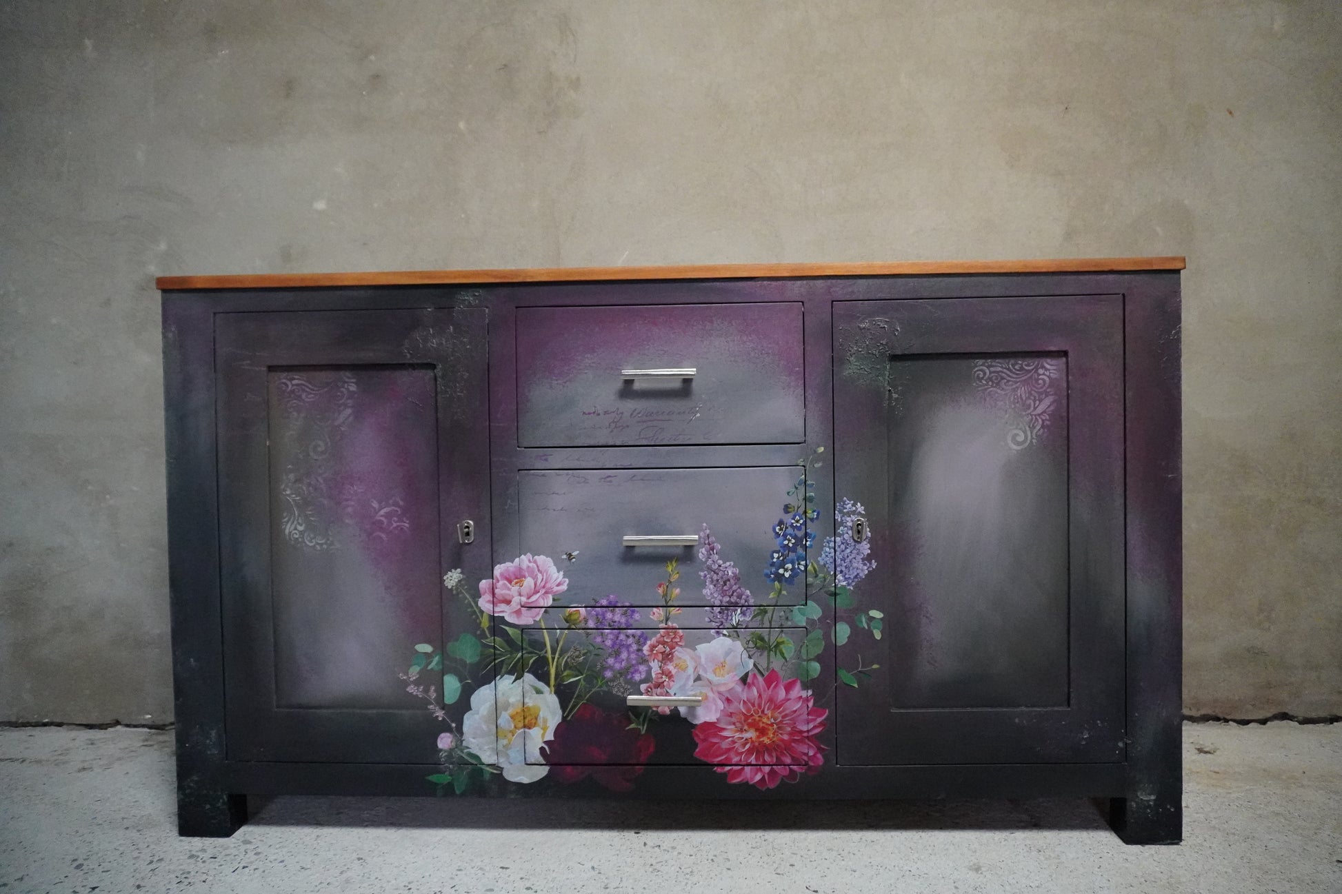 Bij dit dressoir hebben wij onze 2 meest populaire stijlen gecombineerd; De grunge look en de bloemen look. Een unieke kast in kleur en stijl en gemaakt voor een stoere klant die op zoek is naar een kast met een eigen identiteit!
