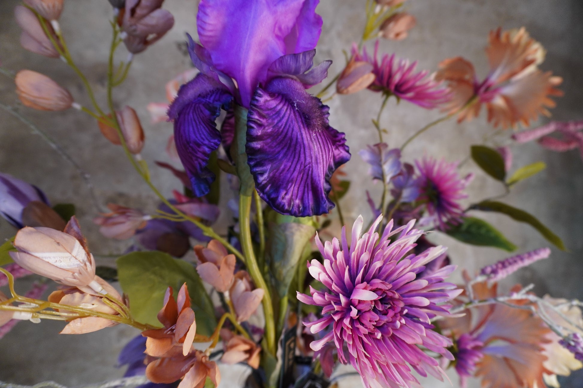 Het boeket bestaat uit een samenstelling van bloemen inclusief Iris, Pistacio & Spin Gerbera