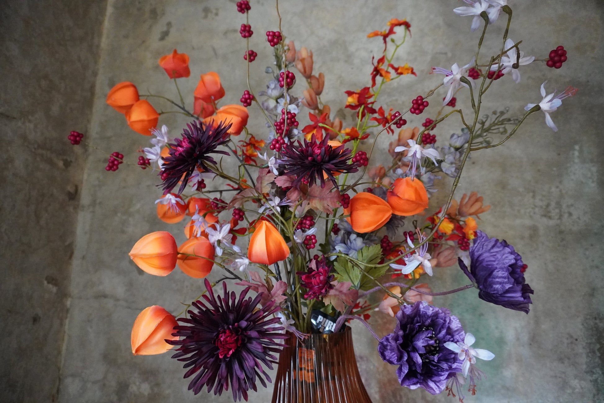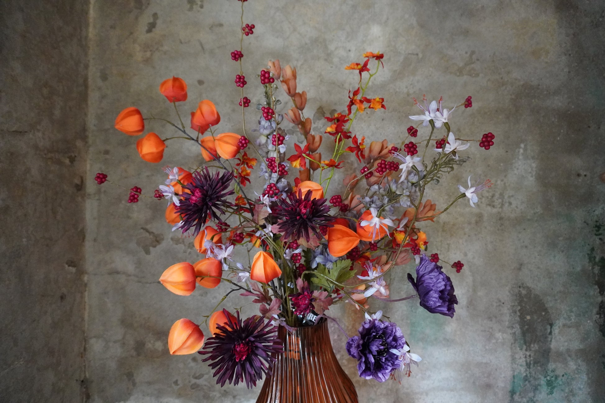 Het boeket bestaat uit een samenstelling van bloemen inclusief Dansende Orchidee, Besjes, Purper Klokje, Klaproos, Spin Gerbera, Delphinium, Lantaarns & Pistachio
