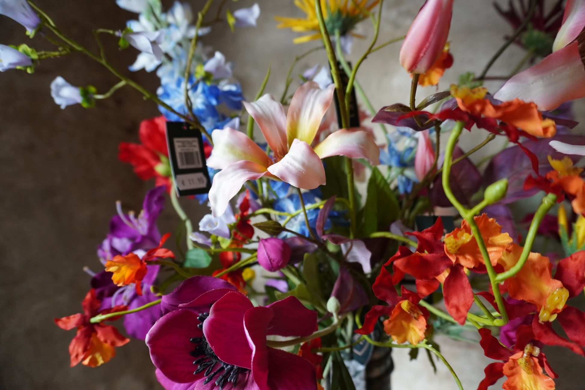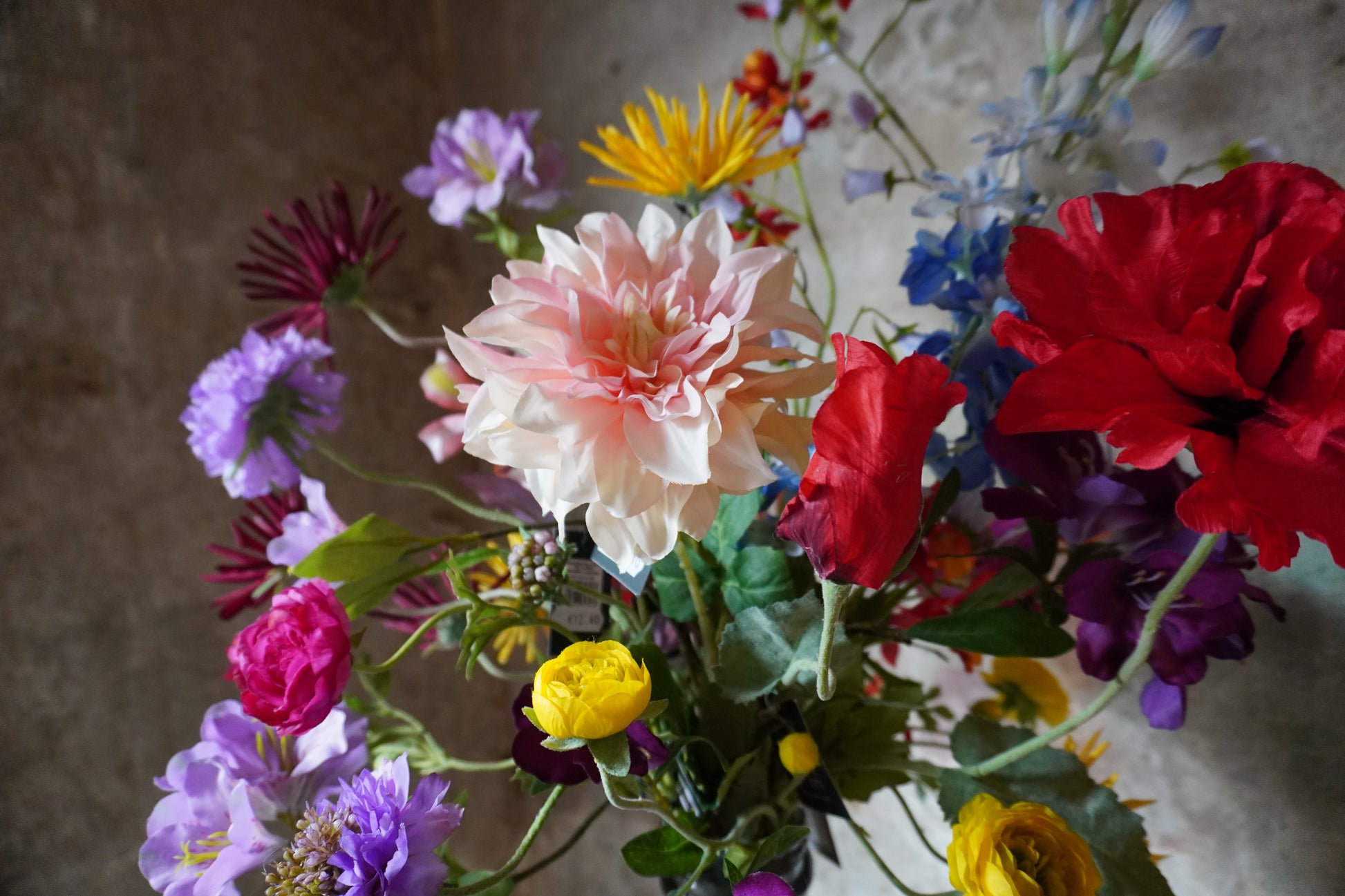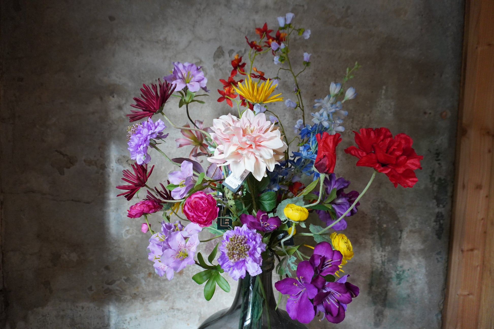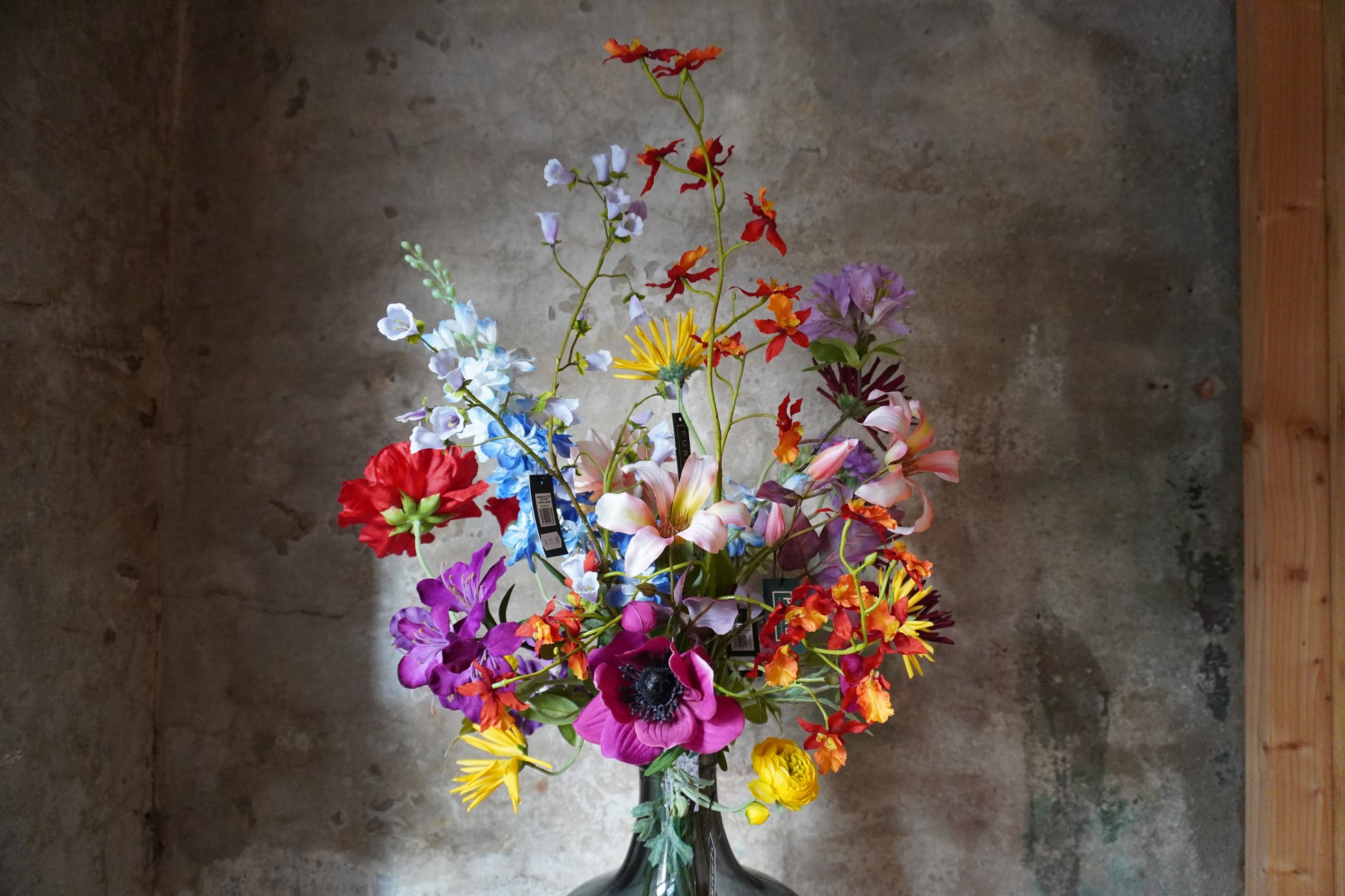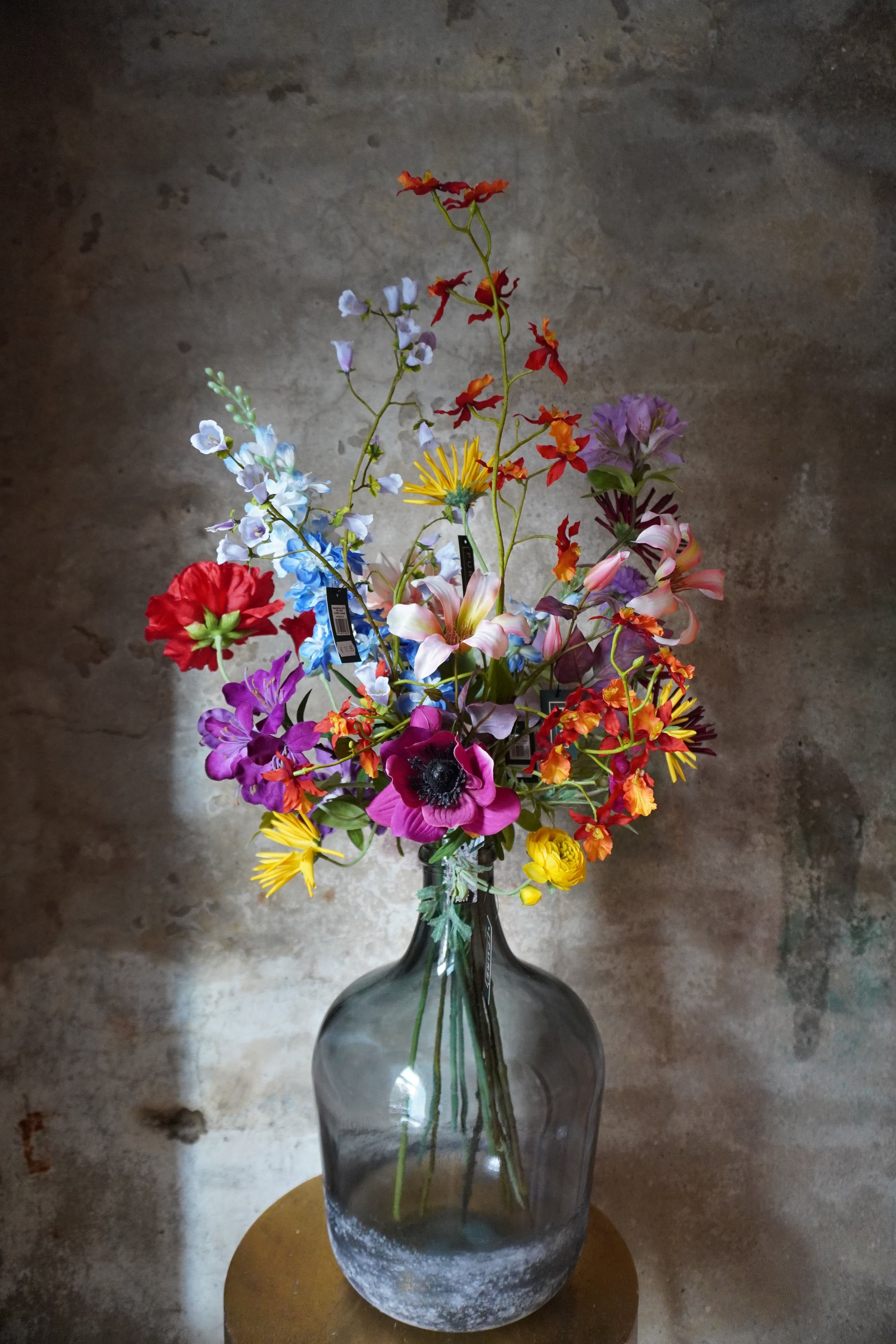 Het boeket bestaat uit een samenstelling van bloemen inclusief dansende orchidee, Ranonkols, Delphinium, rhododendron, Anemone, Dahlias, Weigelia, Lelies, Rudbeckias, Scabiosa en een Klaproos.