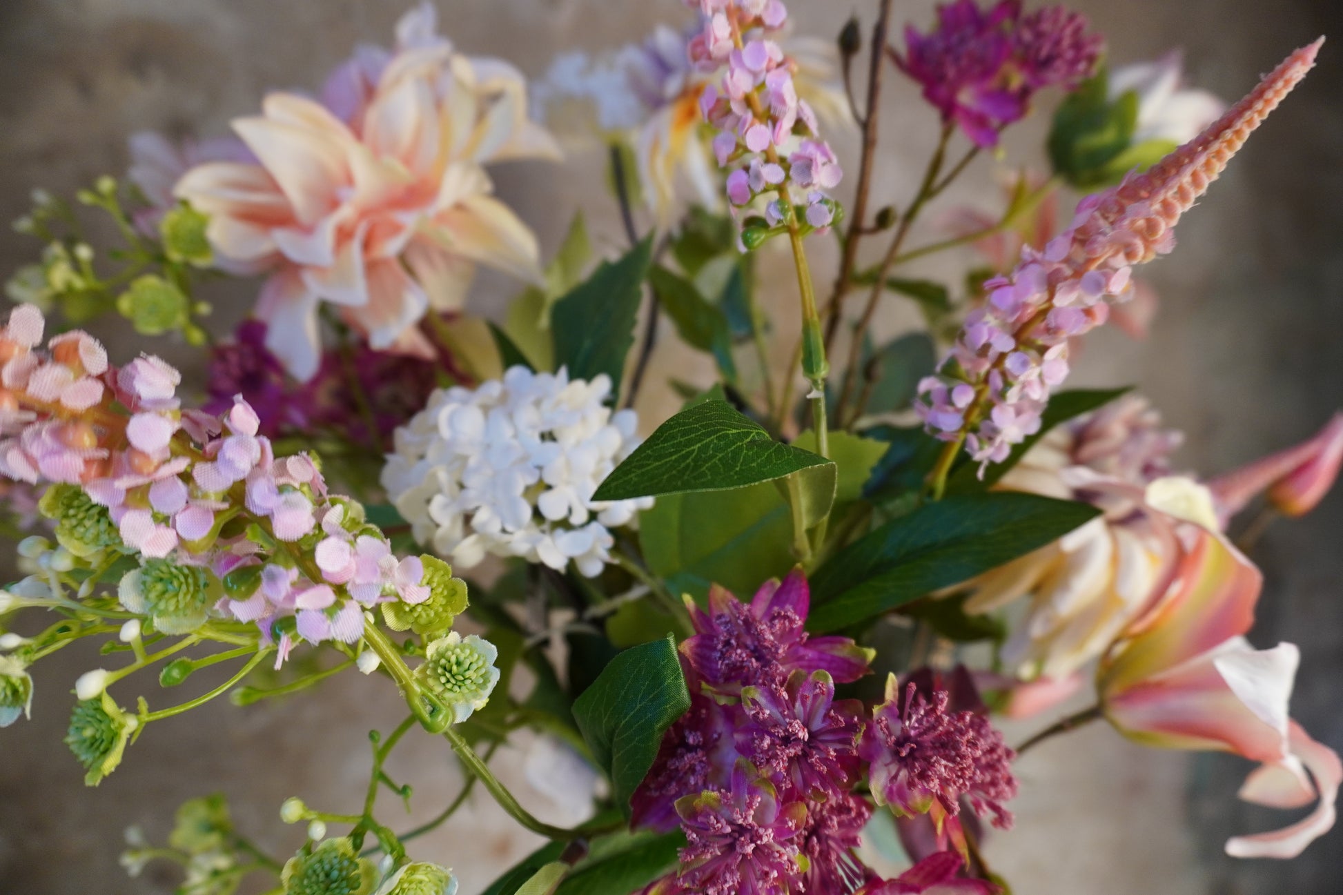 Het boeket bestaat uit een samenstelling van bloemen inclusief Spray Dahlia, Zeeuwse knoopje, Gipskruid, Snowball, Spray Veronika & Eucalyptus