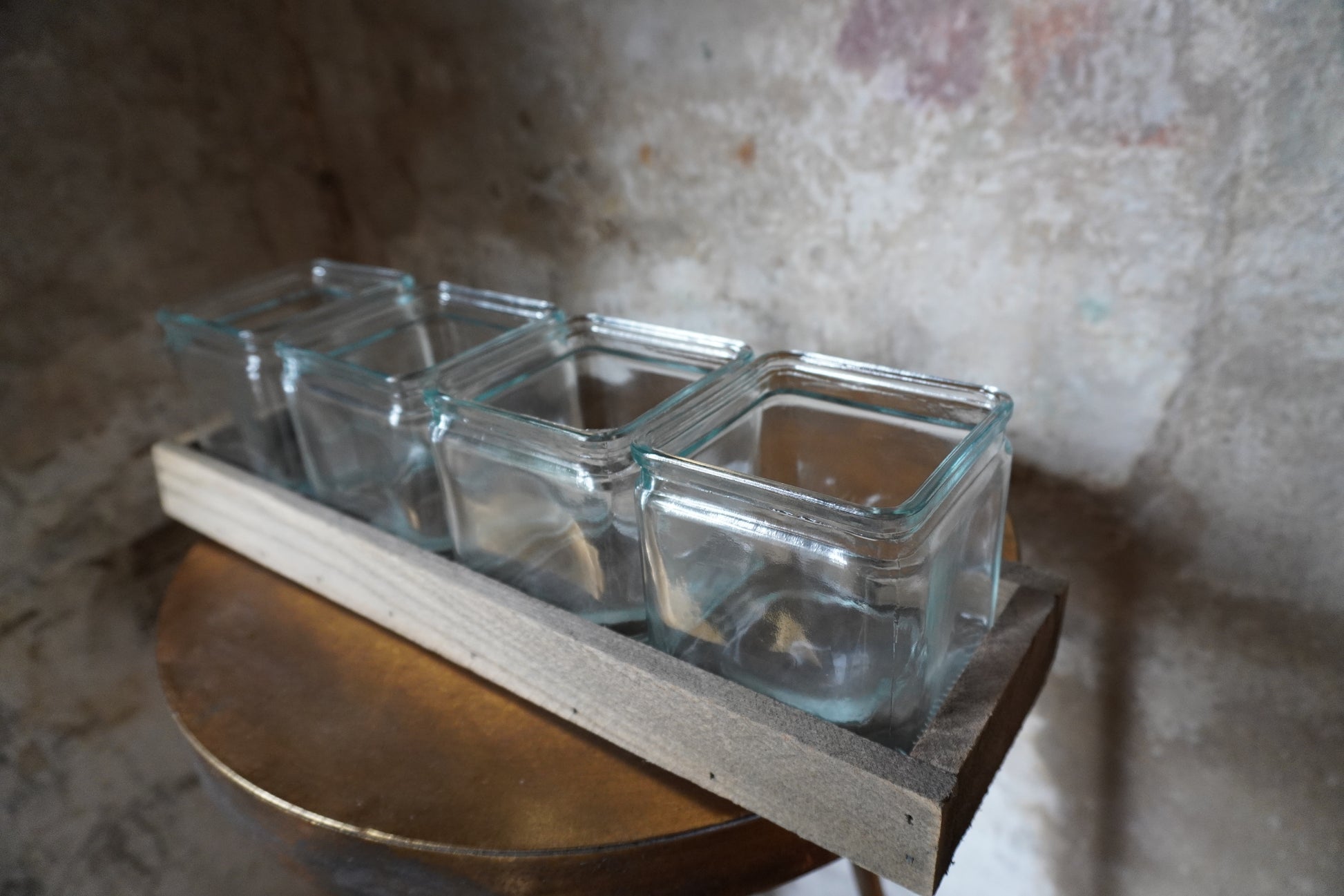 Glazen windlichten/ vazen op houten tray - 44cm x 13.5cm x 4cm/10cm