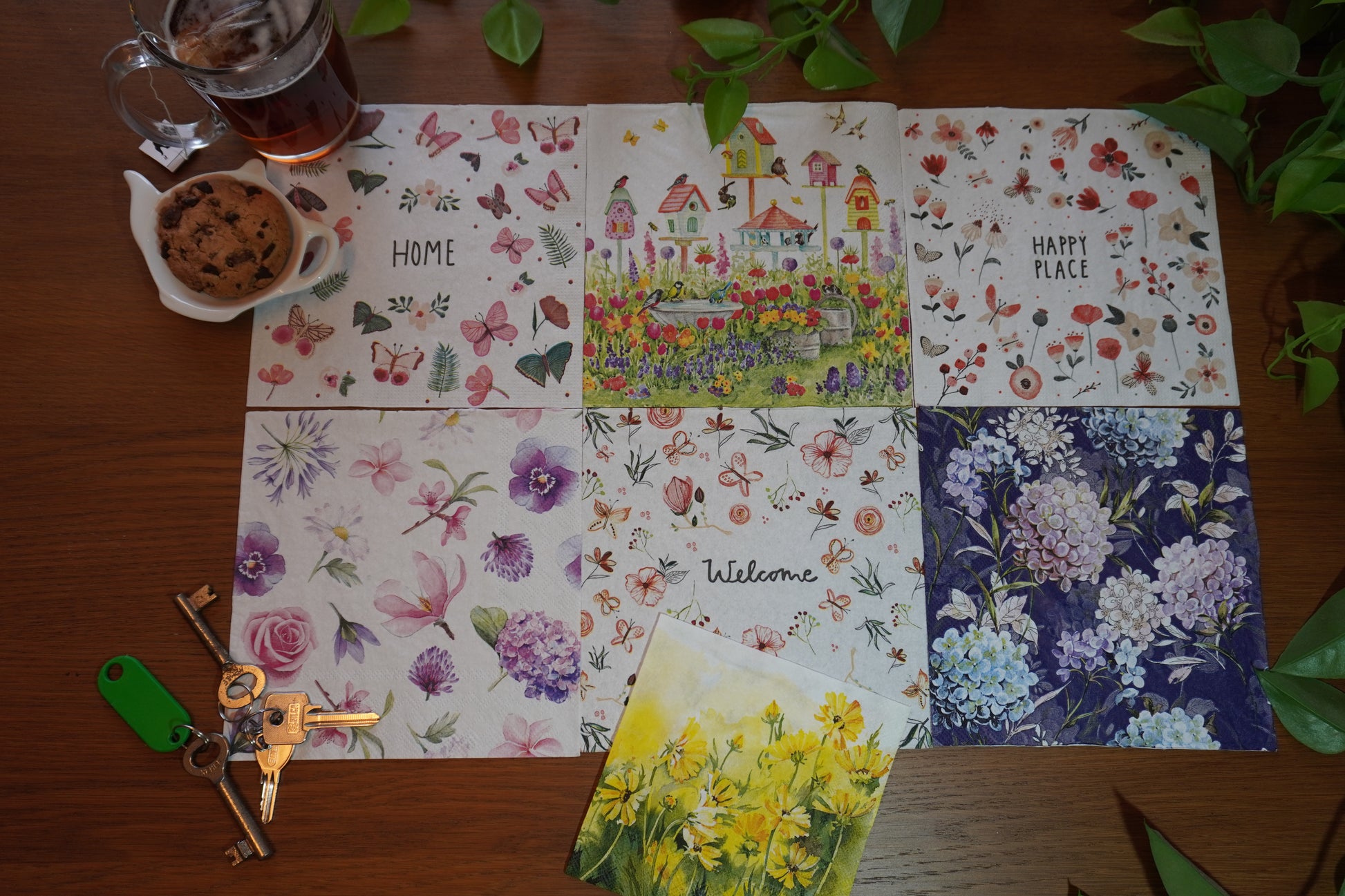 Deze doos bevat twee 12cm hand gegoten voor geschilderde gips harten met een haakje, Modge Podge lijm, een kwast, schuurpapier en 8 door ons persoonlijk gekozen servetten.