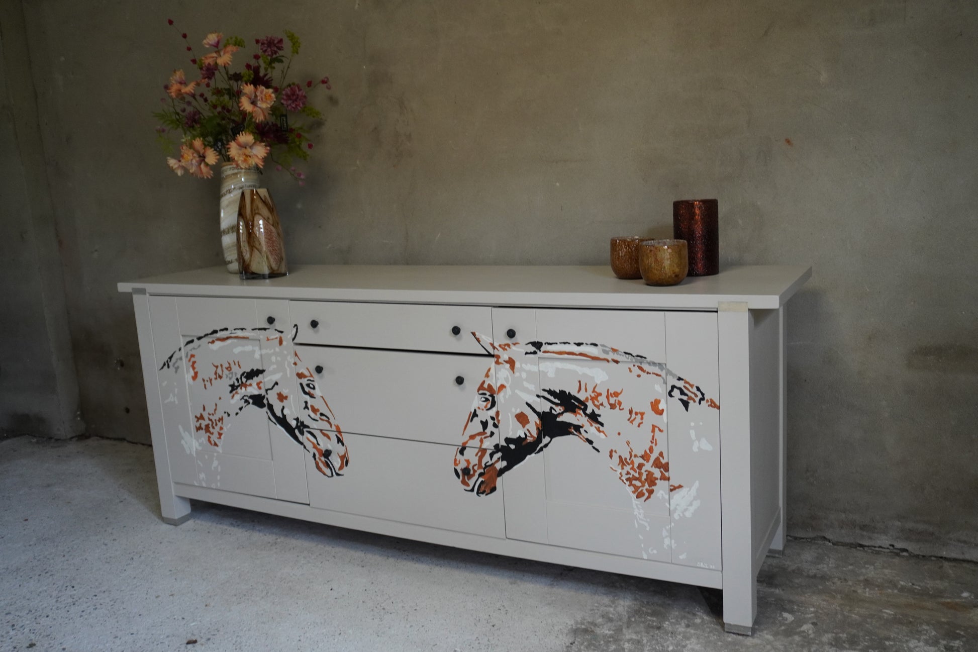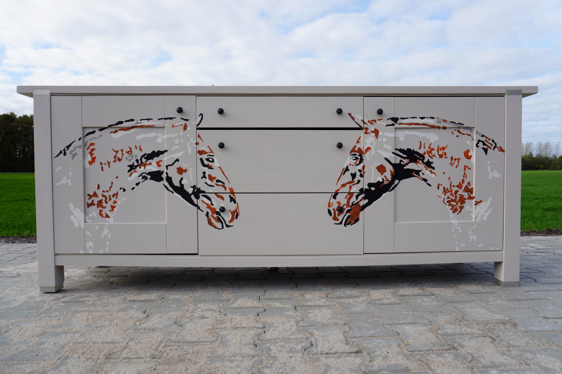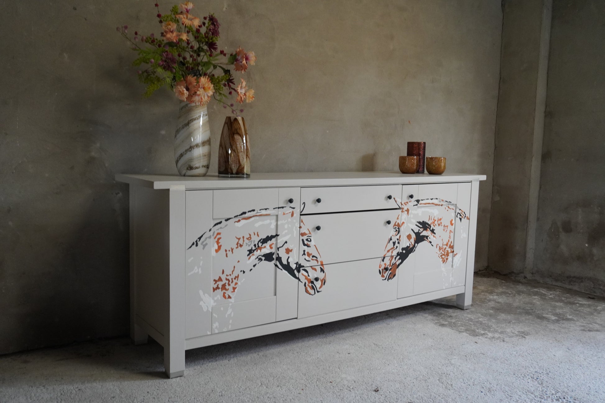 Geverfd door ons met de top producten van Niveau. Wij hebben het dressoir eerst geschuurd, daarna behandeld met BIN primer, gevolgd door Niveau krijtverf in de kleur Authentic Taupe. De paarden zijn ook geschilderd met Niveau krijtverf. Het geheel is afgewerkt met Polyvine vernis waardoor deze kast niet alleen mooi is, maar ook zeer bruikbaar.