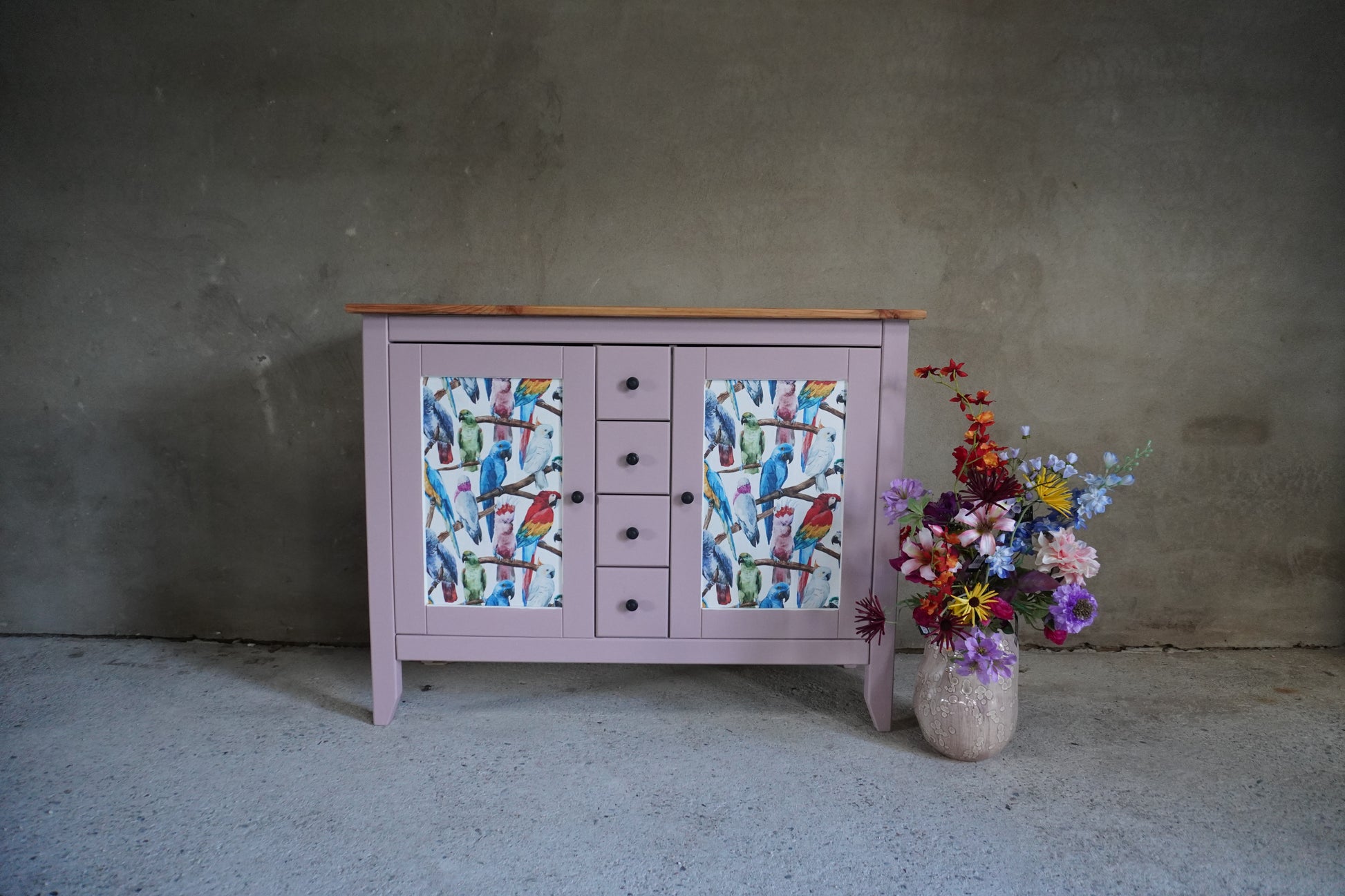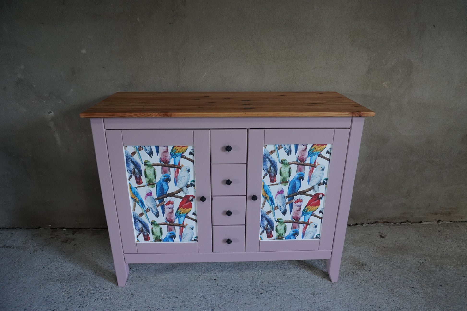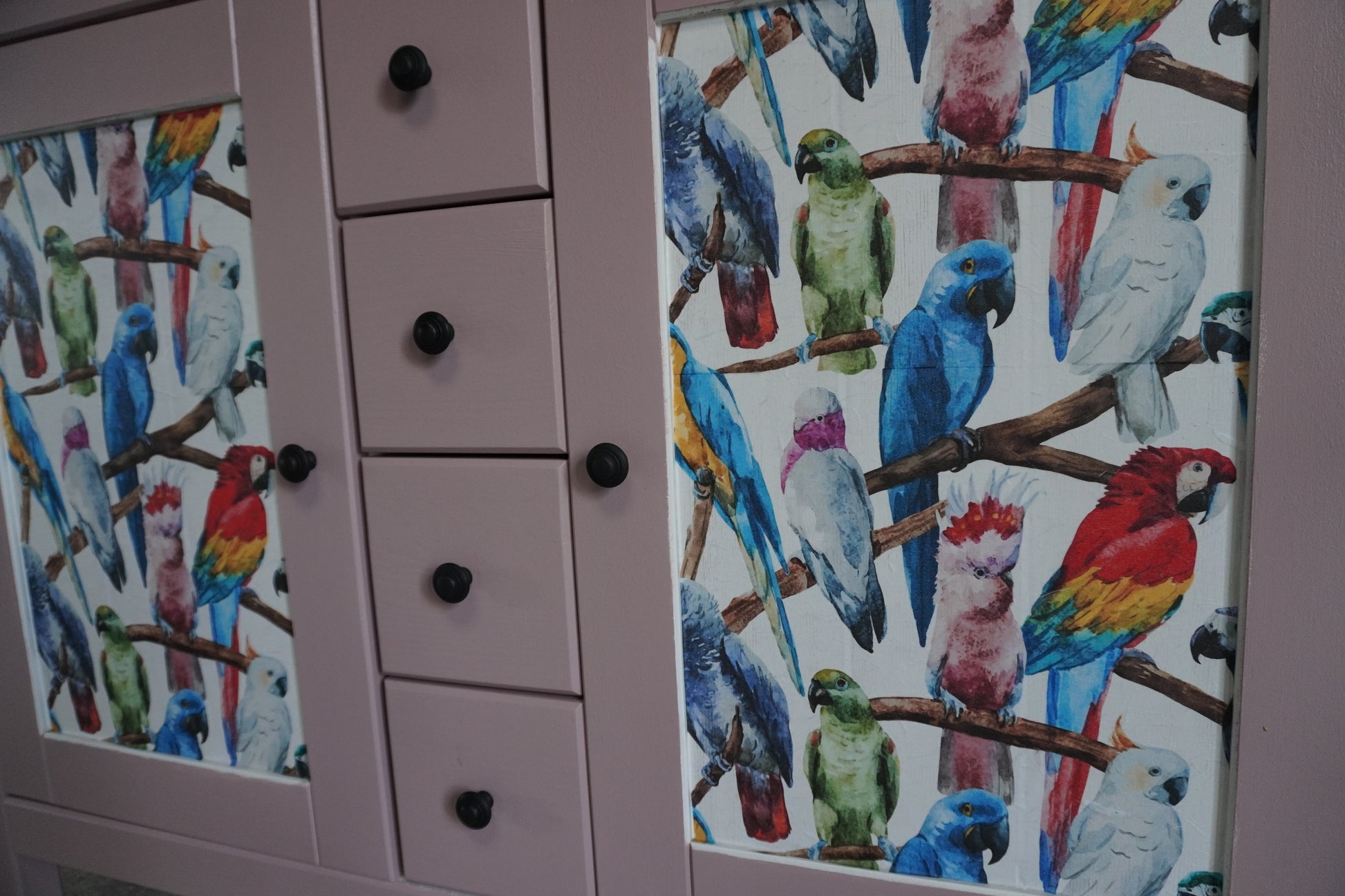 Voor dit dressoir hebben wij gekozen voor een vrolijke uitstraling. Een warme, roze kleur in combinatie met een vrolijk maar stijlvol Papagaaien patroon maakt dit dressoir helemaal uniek en extra leuk als je van vogels houdt!
