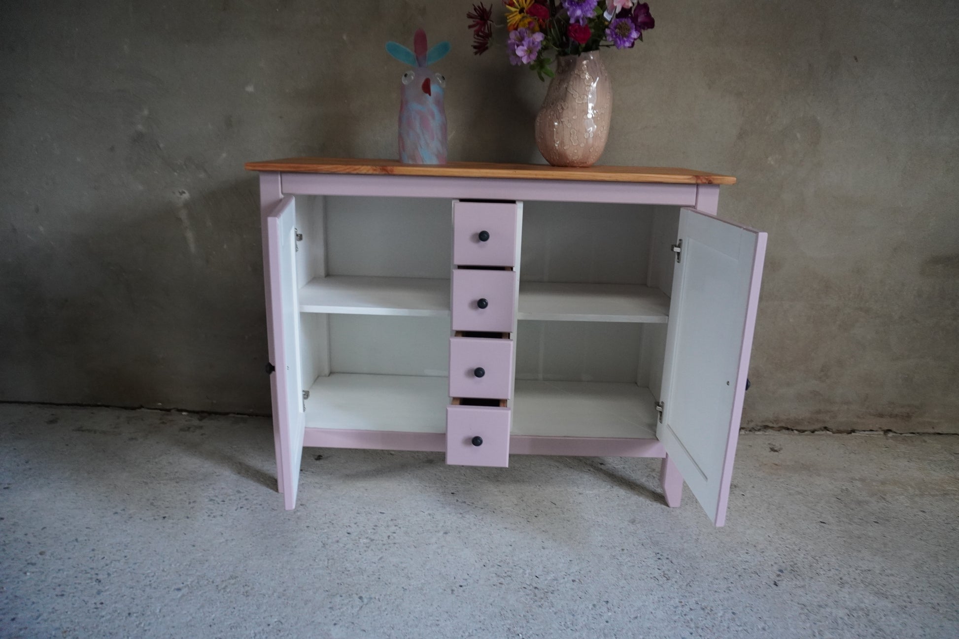 Geverfd door ons met de top producten van Niveau. Wij hebben het dressoir eerst geschuurd, daarna behandeld met BIN Aqua primer, gevolgd door Niveau krijtverf in de kleur Authentic Rose. Op de deurtjes hebben we een gezellig papagaaien decoupage papier aangebracht van Dixie Belle - Belles & Whistles . Het geheel is afgewerkt met Polyvine vernis waardoor deze kast niet alleen mooi is, maar ook zeer bruikbaar.