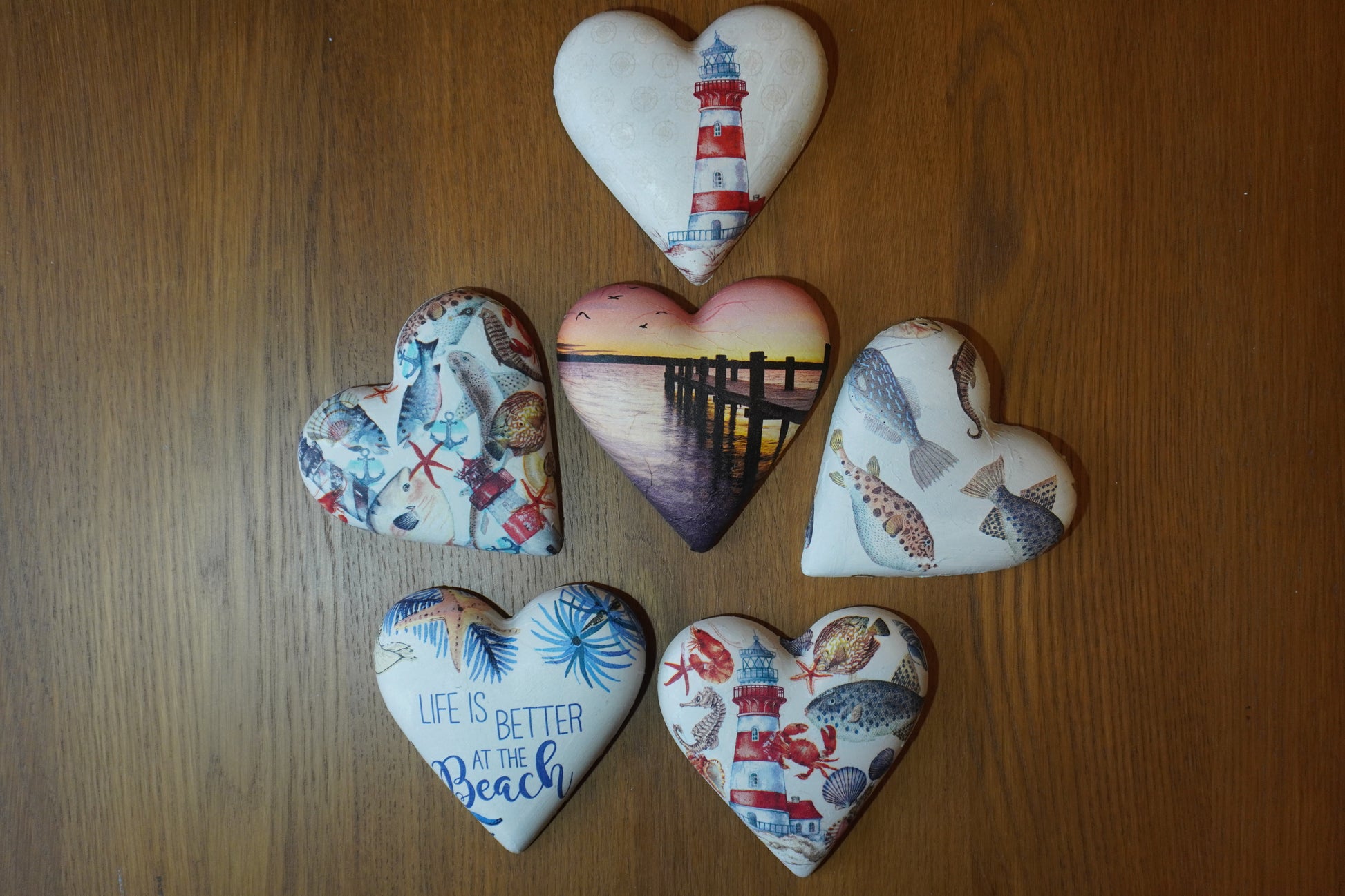 Deze doos bevat twee 12cm hand gegoten voor geschilderde gips harten met een haakje, Modge Podge lijm, een kwast, schuurpapier en 9 door ons persoonlijk gekozen servetten.