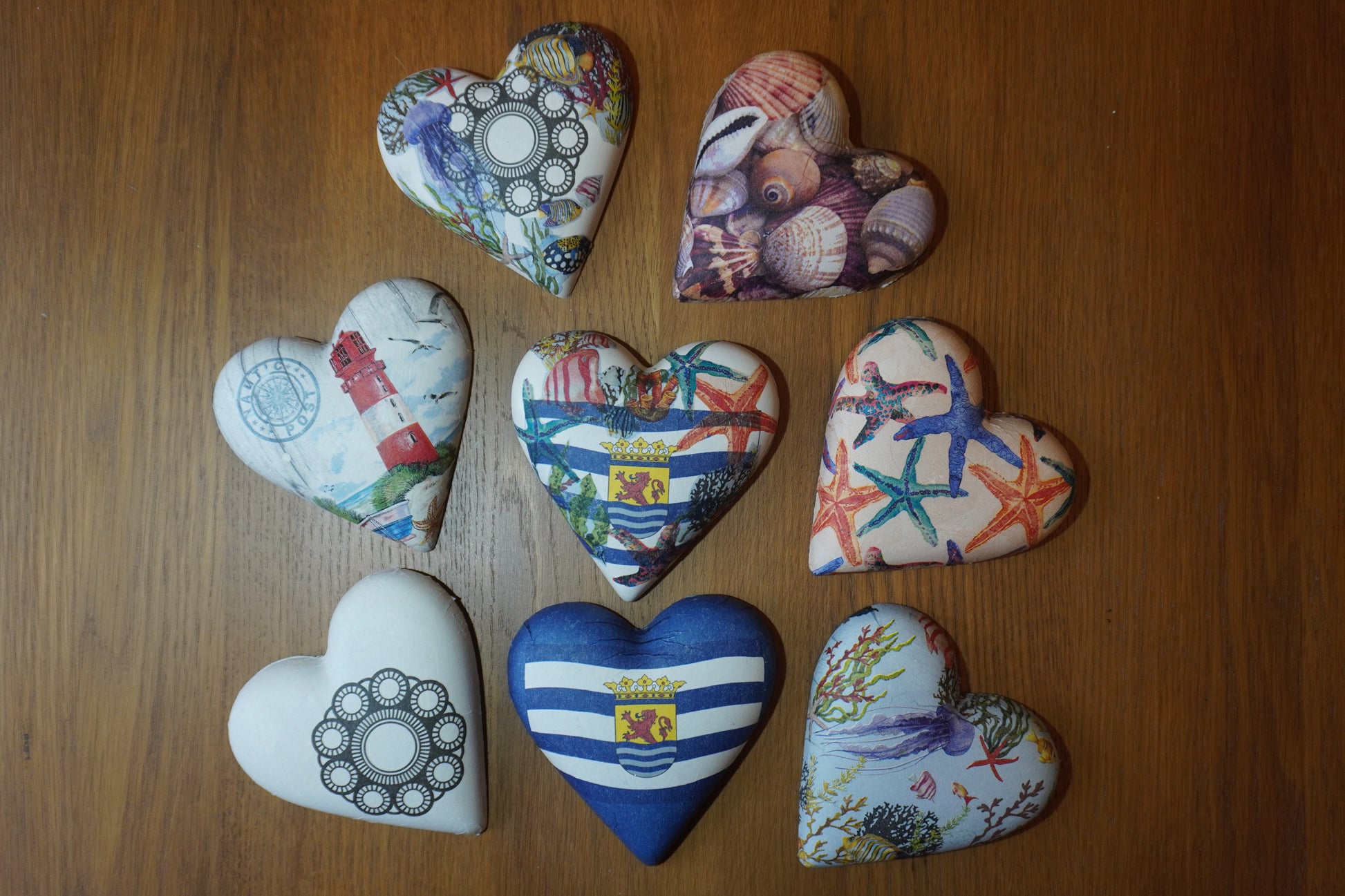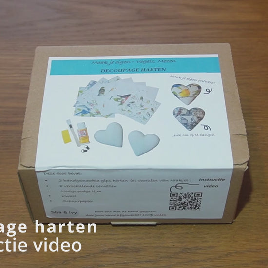 Deze doos bevat twee 12cm hand gegoten voor geschilderde gips harten met een haakje, Modge Podge lijm, een kwast, schuurpapier en 7 door ons persoonlijk gekozen servetten.